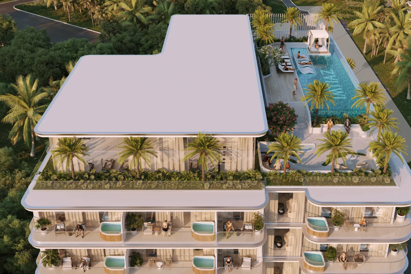 Amenities include a clubhouse, indoor gym, indoor games area, and a rooftop leisure deck with a pool, lounge zones, and landscaped spaces. The architecture combines clean lines with nature-inspired design, offering modern comfort in a serene setting